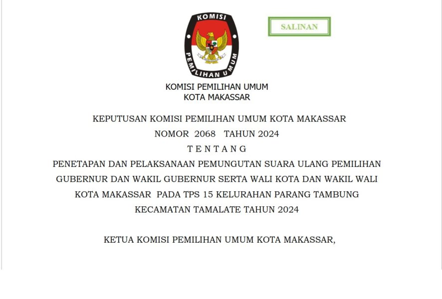 Berdasarkan Keputusan Komisi Pemilihan Umum Kota Makassar Nomor 2086 Tahun 2024 tentang Penetapan Dan Pelaksanaan Pemungutan Suara Ulang Pemilihan Gubernur Dan Wakil Gubernur Serta Wali Kota Dan Wakil Wali Kota Makassar Pada Tps 15 Kelurahan Parang Tambung Kecamatan Tamalate Tahun 2024.
