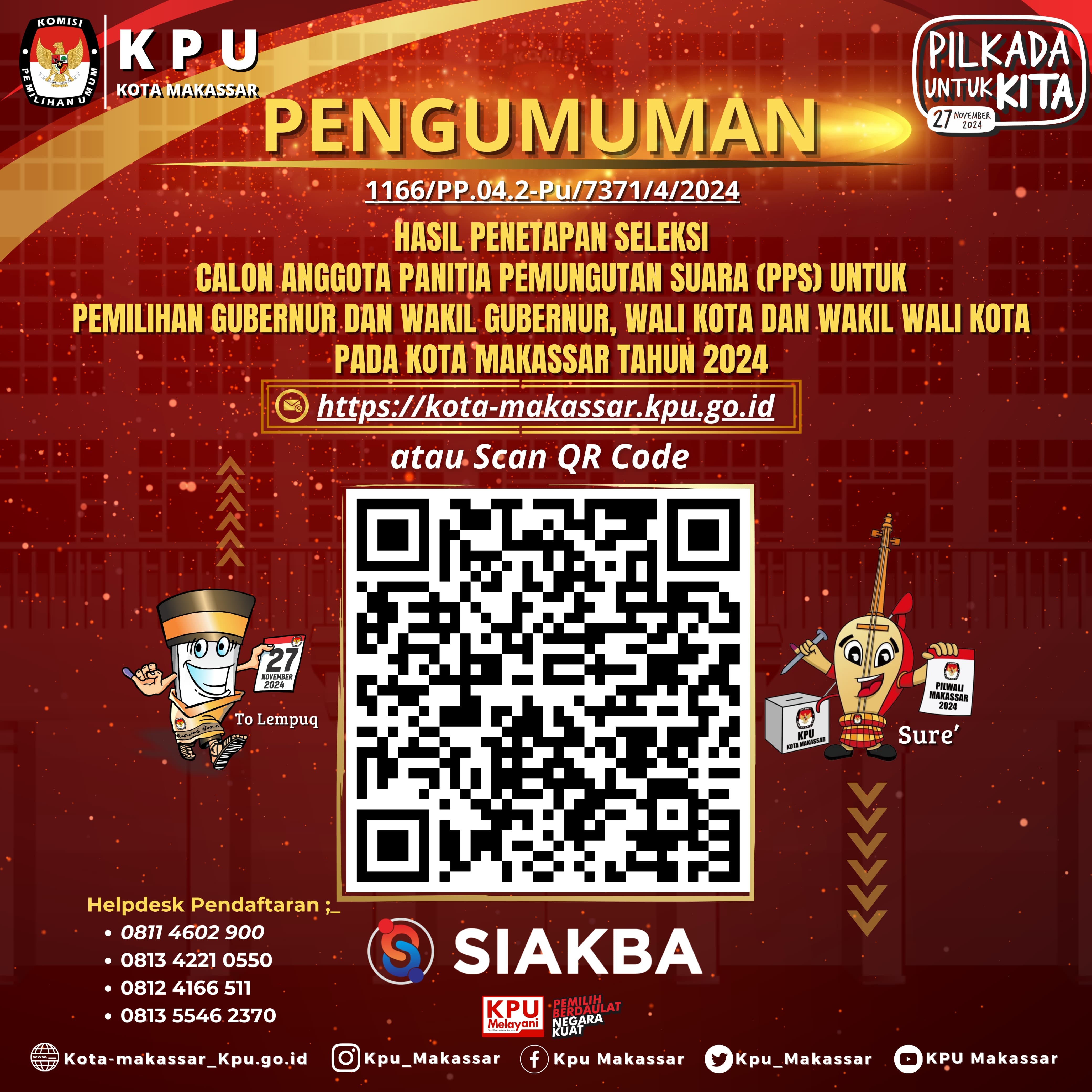 Pengumuman Nomor : 966/PP.04.2-Pu/7371/2024, tentang Hasil Penelitian Administrasi Calon Anggota Panitia Pemilihan Kecamatan Untuk Pemilihan Gubernur dan Wakil Gubernur dan Wali Kota dan Wakil Wali Kota Makassar Pada Kota Makassar Tahun 2024