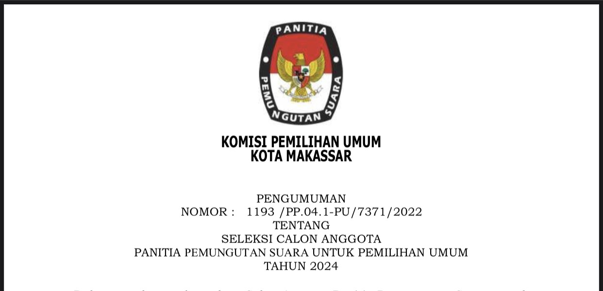 Pengumuman Nomor : 1193/PP.04.1-PU/7371/2022, tentang Seleksi Calon Anggota Panitia Pemungutan Suara untuk Pemilihan Umum Tahun 2024.