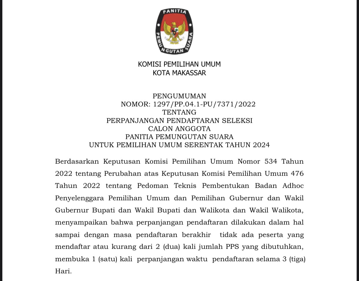 Pengumuman Nomor : 1297/PP.04.1-PU/7371/2022, tentang Perpanjangan Pendaftaran Seleksi Calon Anggota Panitia Pemungutan Suara Untuk Pemilihan Umum Serentak Tahun 2024.