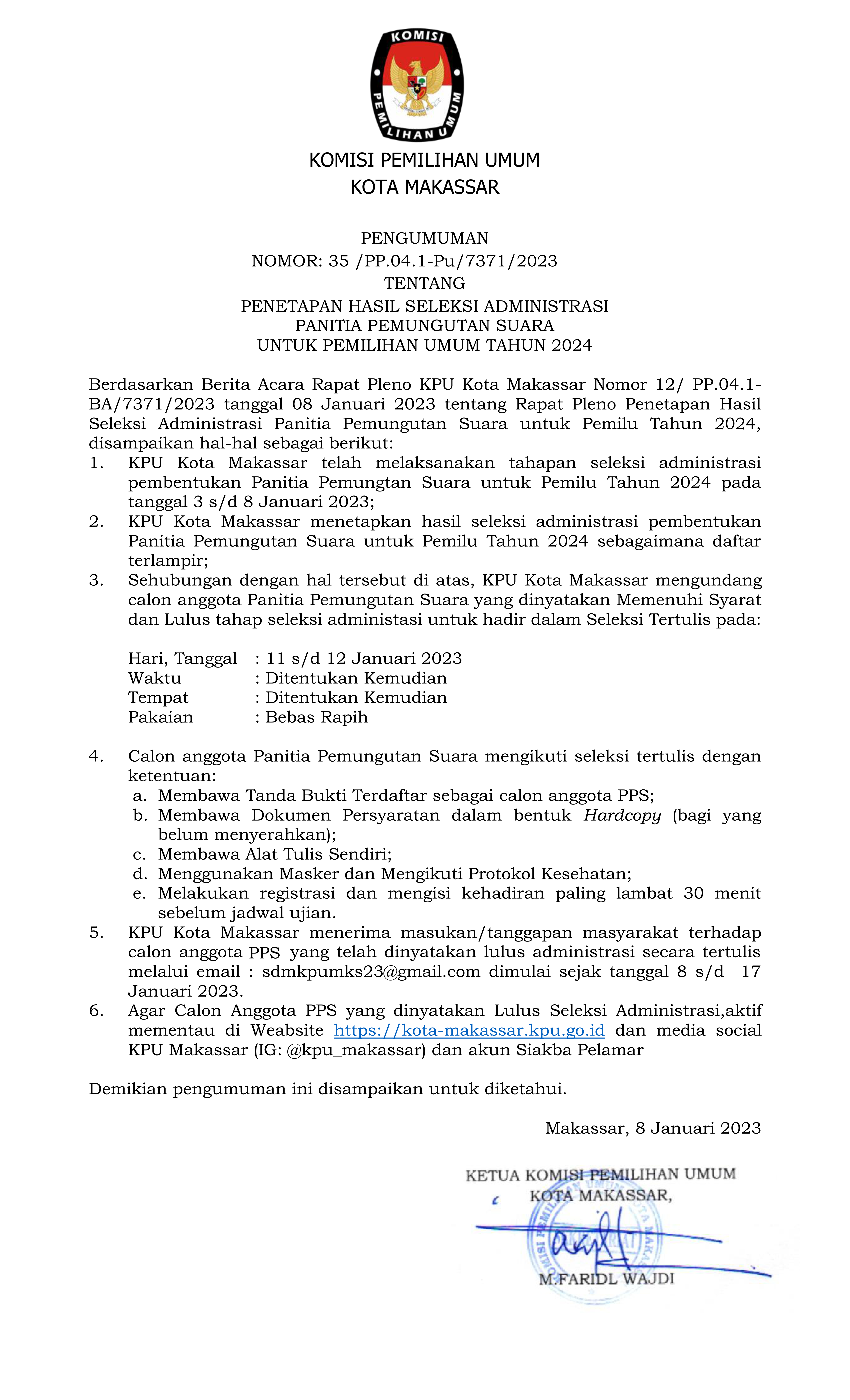 Pengumuman Nomor : 35/PP.04.1-Pu/7371/2023, Tentang Penetapan Hasil Seleksi Administrasi Panitia Pemungutan Suara Untuk Pemilihan Umum Tahun 2024