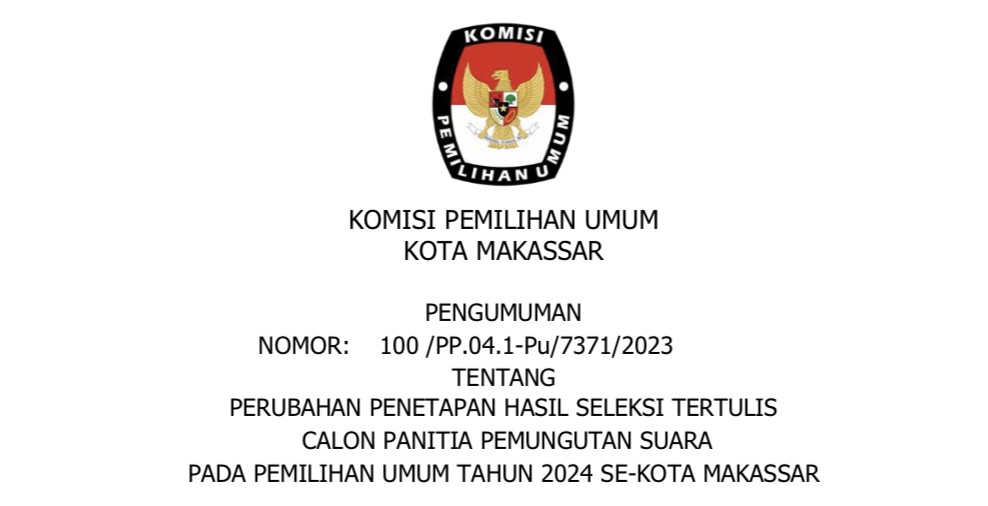Pengumuman Nomor : 100/PP.04.1-Pu/7371/2023, tentang Perubahan Penetapan Hasil Seleksi Test Tertulis Calon Panitia Pemungutan Suara Pada Pemilihan Umum Tahun 2024